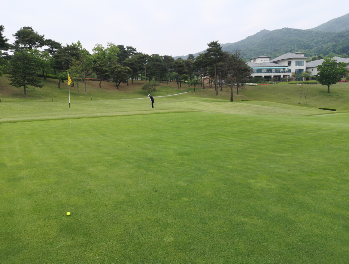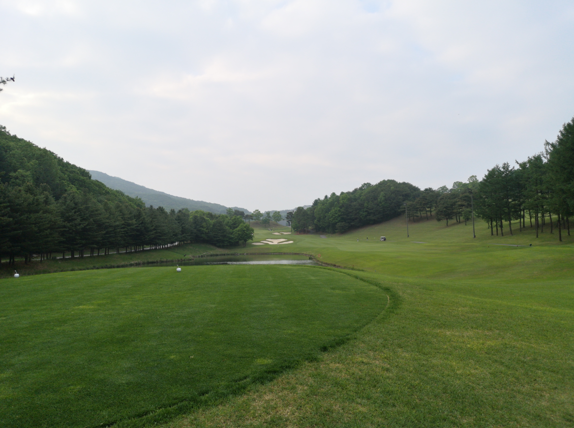 왼쪽으로 살짝 휘어있는 느낌의 1번홀입니다. 큰 문제는 없었던 것 같고, 3온을 한 뒤