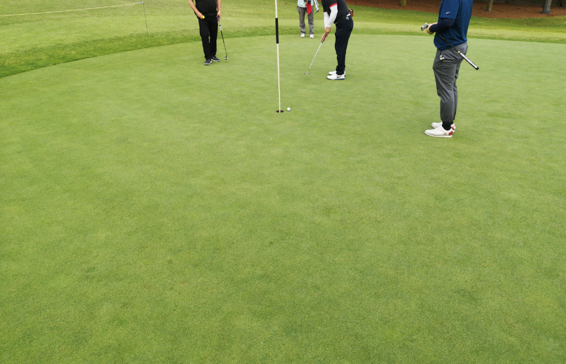 퍼팅을 두 번 [컨시드] 해서 파를 잡아냅니다. 아마추어에게 귀중한, 파를 잡았네요 (PAR)